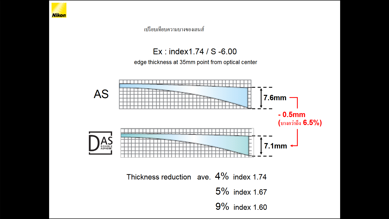 จะเห็นได้ว่าเมื่อเปรียบเทียบความบางของเลนส์โครงสร้างแอสเฟียริคหน้าหลังกับเลนส์ทั่วไปและเลนส์โครงสร้างแอสเฟียริคด้านเดียวจะมีความบางมากสุด และเมื่อเปรียบเทียบให้เห็นถึงความบางของNikon Lite ASกับNikon Double Asphric ก็จะเห็นได้อย่างชัดเจนว่าในค่าสายตาเดียวกัน Indexเดียวกันแต่มีความบางมากกว่า